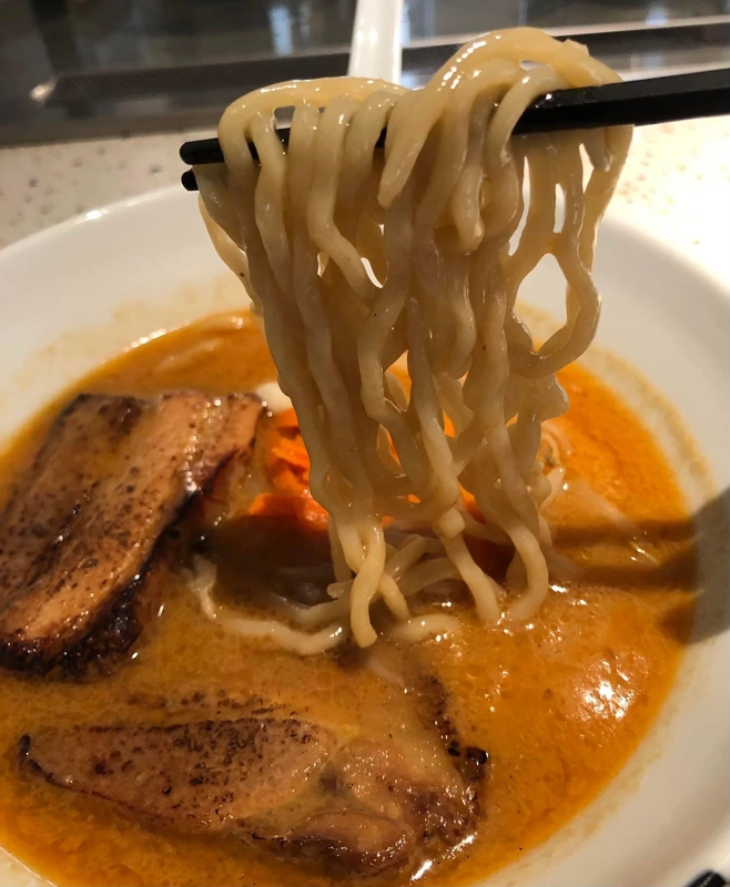 麺(200g)は「キタノカオリ」「春よ恋」「きたほなみ」の北海道産小麦100%を使った縮れ太麺。小麦の風味とツルッツル感がスープに合う。