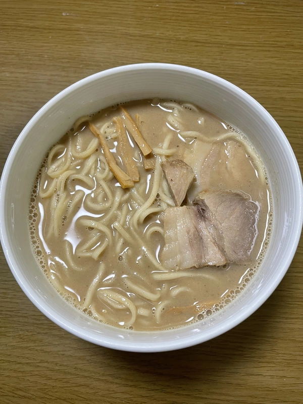 スープは濃厚でドロっとしてるので麺を食べると減りが早いです。濃厚な割にくどくなく飲みやすい。麺はパツパツで食感が良い。チャーシューとメンマはよくある具材かな。