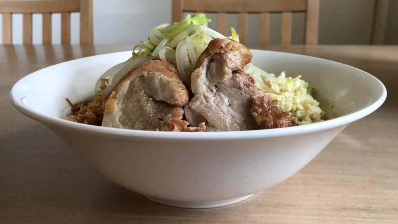 2023年07月31日 豚星。 汁無し蕎麦(二郎インスパイア汁なし・豚骨醤油) 次はマヨネーズを忘れないように ヤサイソノママニンニクマシにフライドオニオンを追加。 自家製極太平打ち縮れ麺は270g! もっちり感が強い麺が、ブラックペッパーと鰹風味が効いたタレによく合うし、何より旨い。 極厚ブタ(2枚)はトロットロ。このブタ、宅麺の二郎系の中でもレベルが高い。 時間が経つにつれタレに溶け込み柔らかくなったフライドオニオンも絶妙で大満足。 味変でマヨネーズを追加し忘れたことが悔やまれます。 1 役に立った レビューを共有