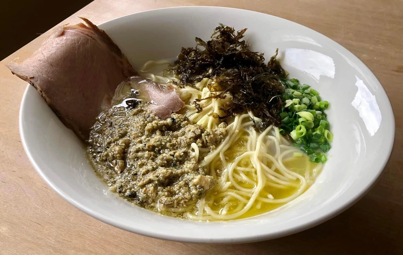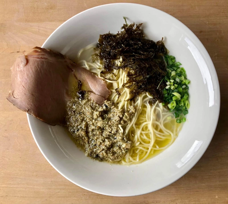 トッピングは付属の牡蠣のアヒージョ、大判チャーシュー。そこに、刻みネギと、このためにネットで取り寄せた岩海苔を自前で追加。