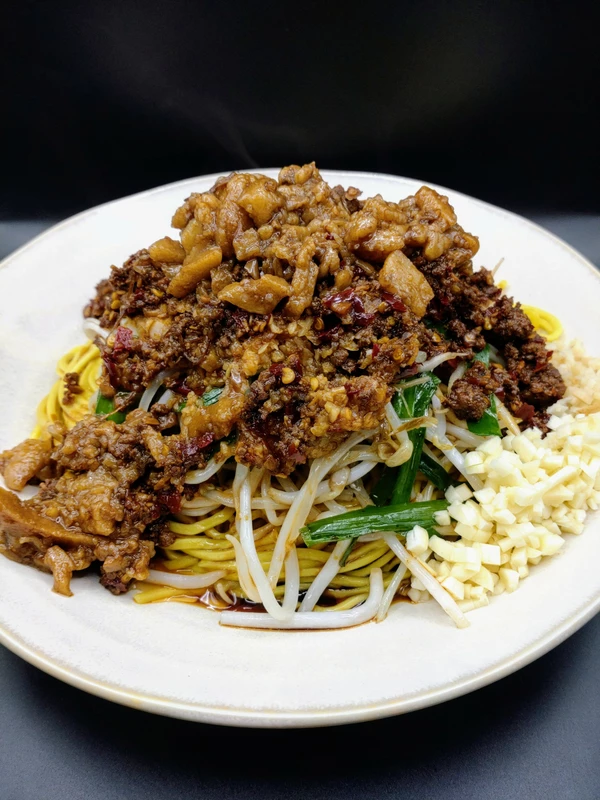こちらを少々硬めに茹であげ、タレで炒めた具材とブリッブリの味付背脂、ニンニクや生姜などお好きな薬味を豪快にトッピングして頂きます。