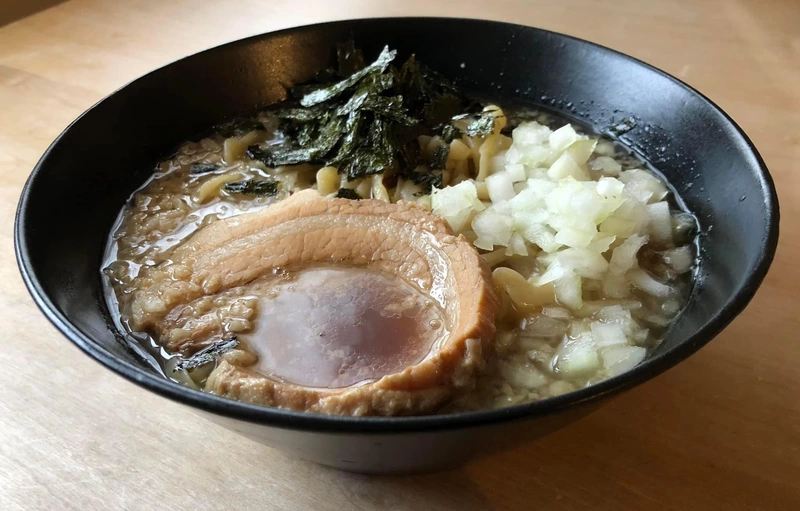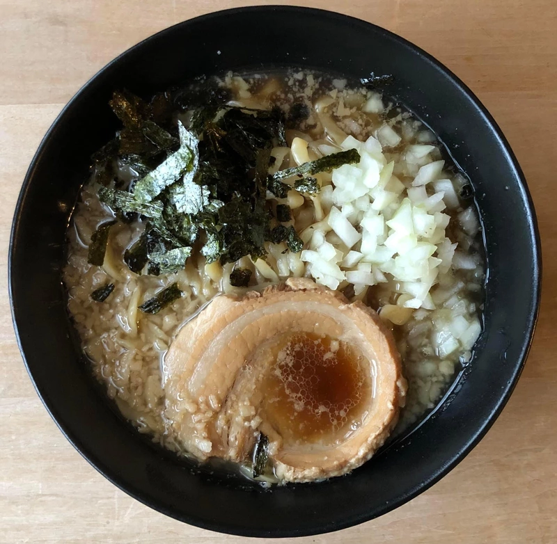 トッピングは刻み玉ねぎと揉み海苔を追加。付属の極厚ブタも味が染みていて、適度な噛みごたえもあり満足度高し。