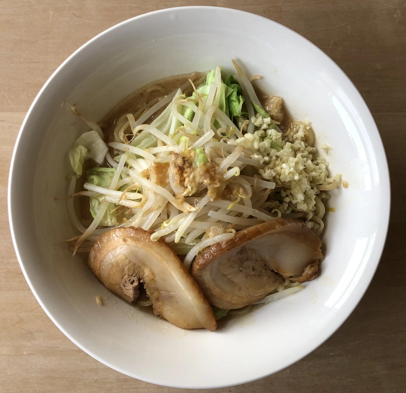 麺(290g)は、全粒粉が入ったやや平打ちの麺。二郎インスパイア系としては規格外なほど細めの麺だけど、もっちりプリプリの食感で、二郎インスパイア系としては逆に新鮮な感じで美味しい。いや、むしろ感動さえ覚えました。
