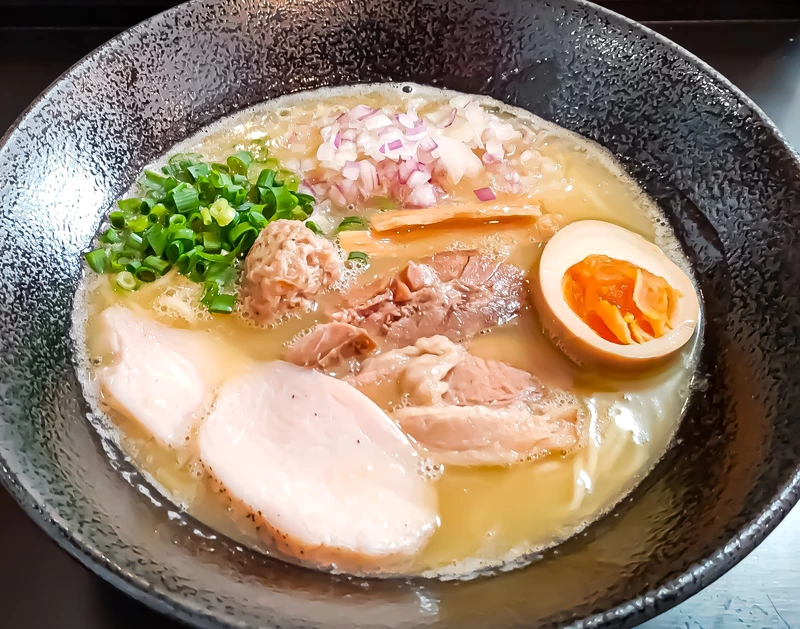青ネギと刻み玉ねぎ、半熟味玉をONするのみで食べ応えのある一杯に。