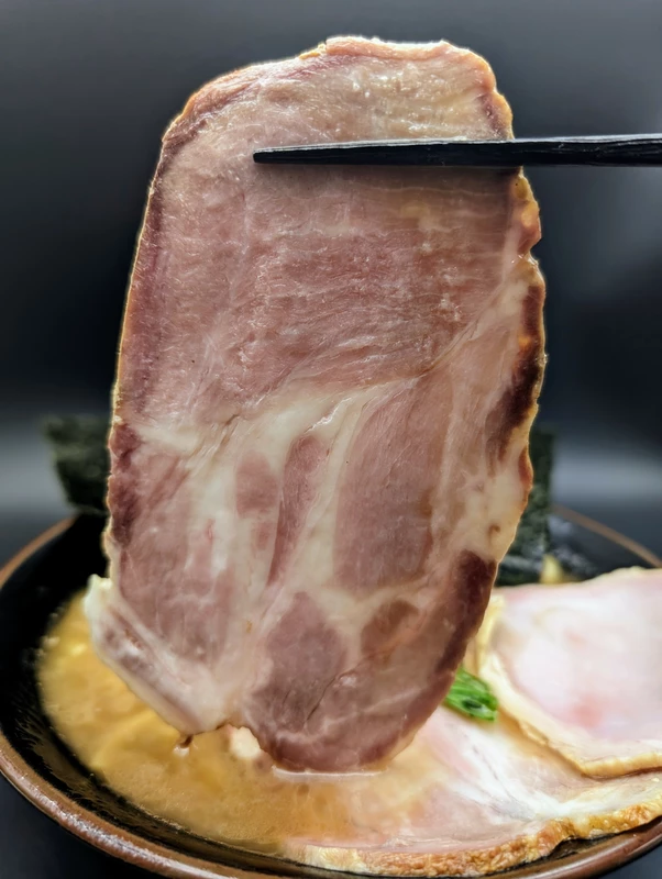 付属トッピングはホウレン草と大判海苔3枚、吊るし焼きの燻製大判ももチャーシューが3枚。