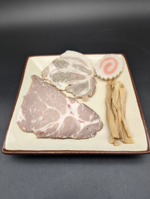付属トッピングは肩ロースのレアチャーシュー、軟らかく煮られたロースチャーシュー、厚切りナルト、