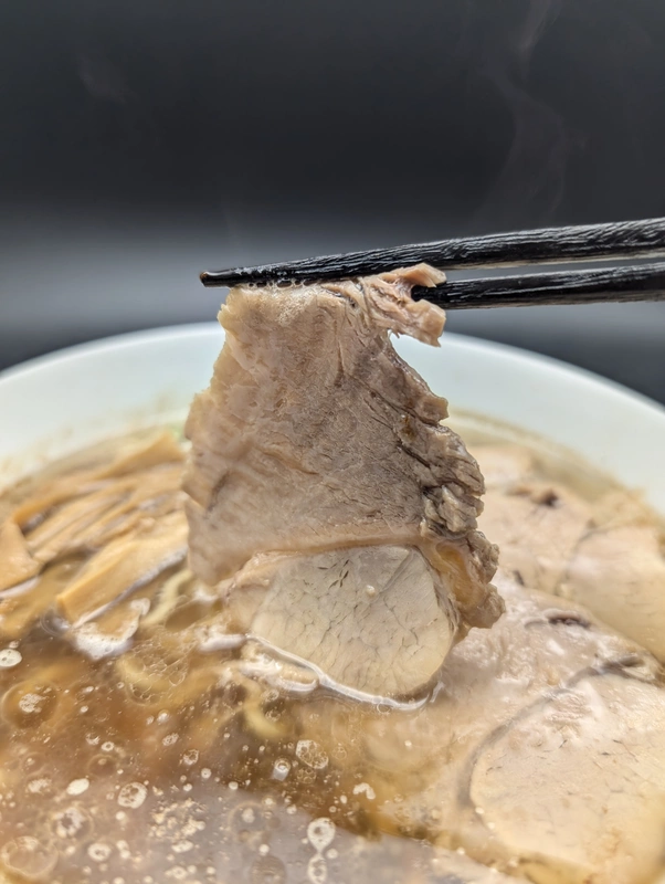 付属トッピングはクラシカルなギシギシ食感のモモチャーシュー4枚と濃口のコリコリメンマ。