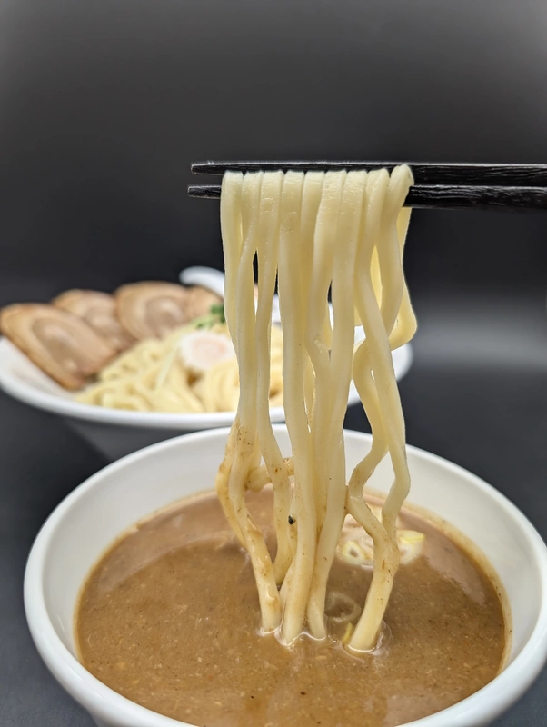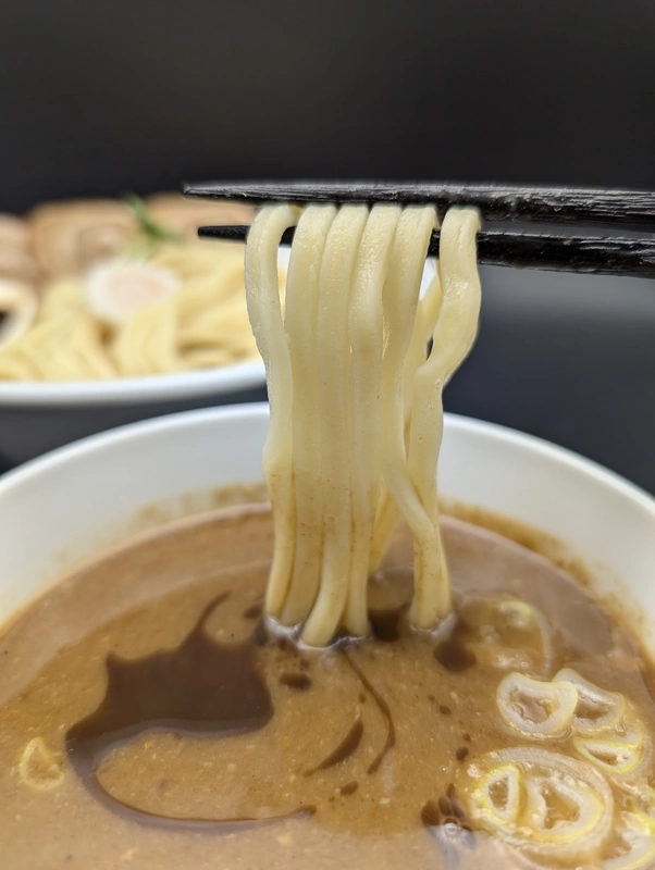 モチモチとした反発力の強いコシと喉越しの良さが魅力で、濃厚なスープをしっかりと持ち上げ、味の相性も申し分ありません。