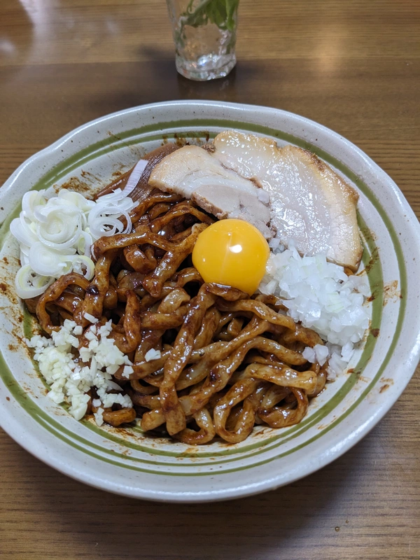 麺:9分、トッピング:刻み葱、刻み玉ねぎ、刻みにんにく、卵黄