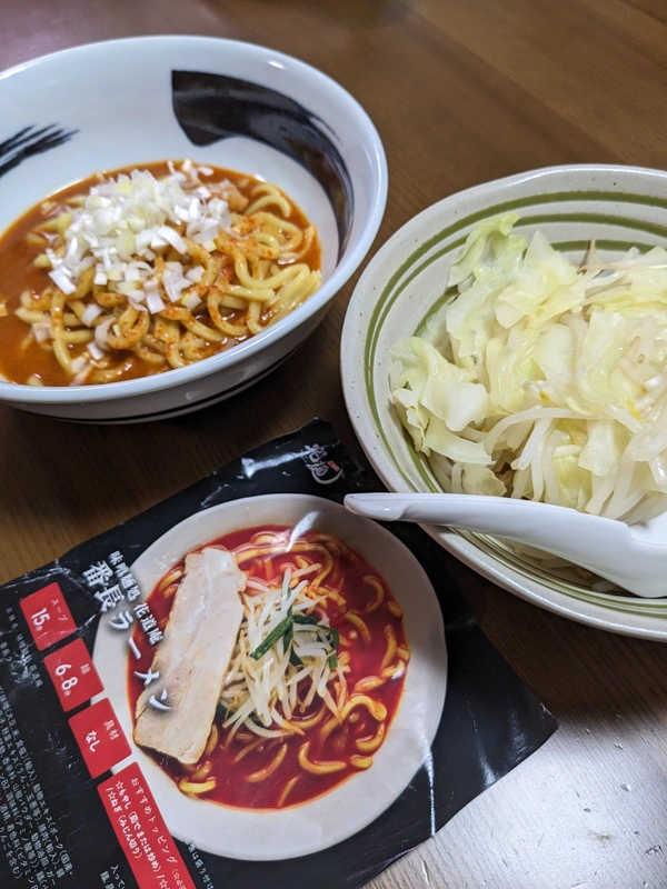 麺:6分、トッピング:もやし2袋、刻みネギ、キャベツ5枚くらい