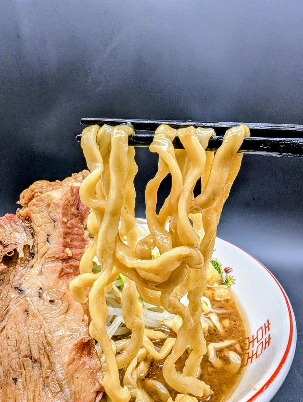 麺は自家製の低加水角刃平打ウェーブで、富士丸らしい手揉み感のあるうねりと圧縮性のワシゴワ食感。