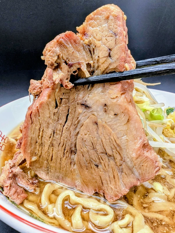 付属トッピングはInスープで、ホロムチの軟らかいウデ肉のブタが大迫力のドデカサイズでドーンと1塊。