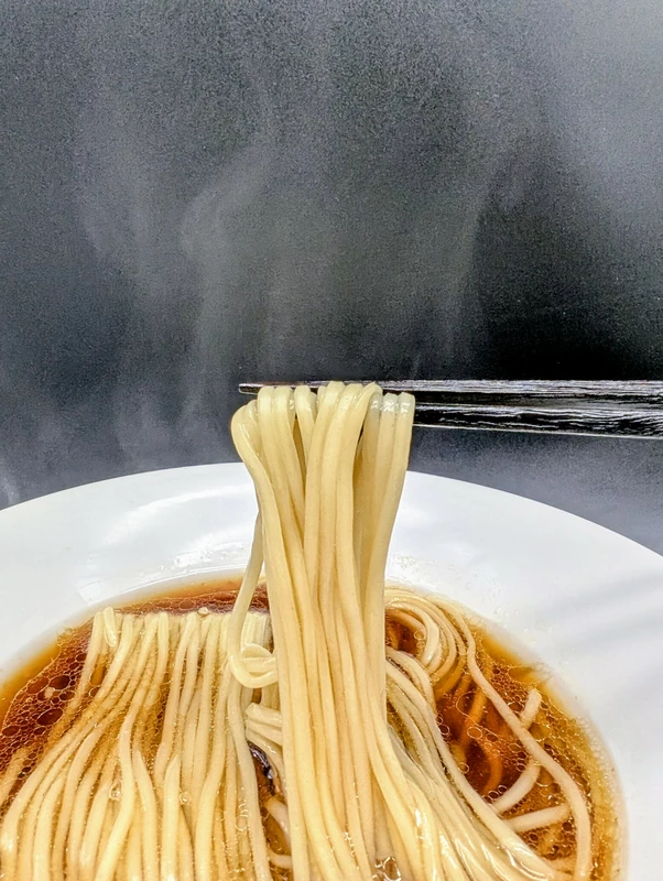 麺は三河屋製麺のスクエア型角刃中細ストレート。瑞々しくしなやかでスープの吸い上げも良く、序盤はプリコリの強い弾力ながら、後半は一体感の増したモチフワの食感に変化します。