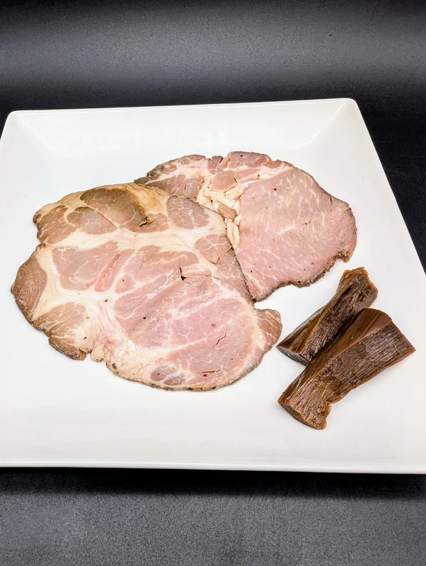 付属トッピングは表面を香ばしく焼かれた豚肩ロースの低温調理レアチャーシュースライスが2枚と、老抽王で黒く染まったゴリゴリ食感のあまうま極太黒メンマが2本。