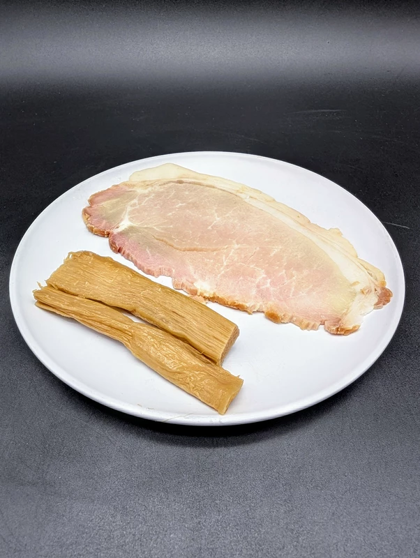 付属トッピングは板海苔が1枚と、ジャキジャキ食感の濃口極太メンマが2本、やや厚めなスライスの燻香漂う豚ロースレアチャーシューが1枚。