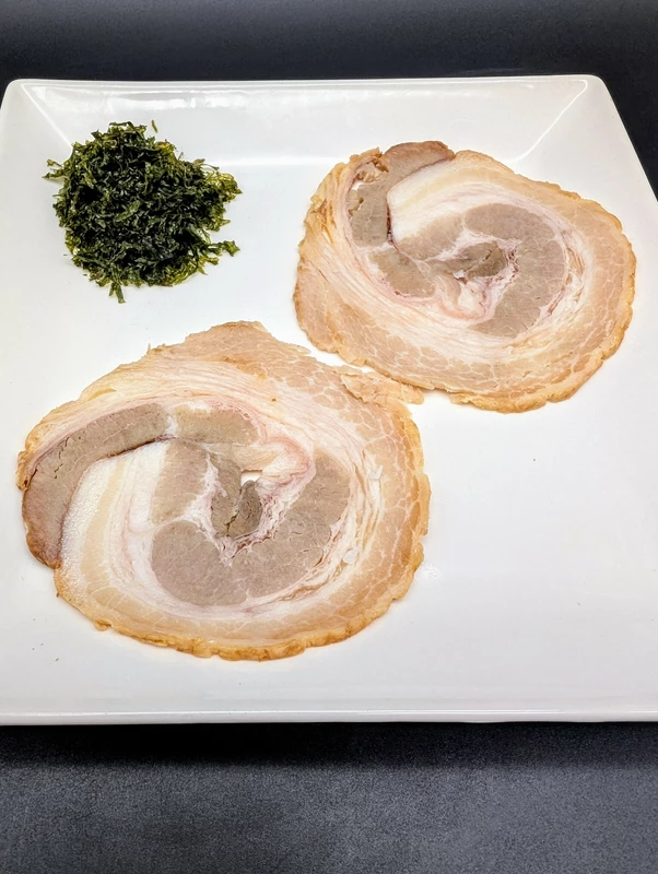 付属トッピングは豚バラロールチャーシュスライス2枚とバラのり1p。