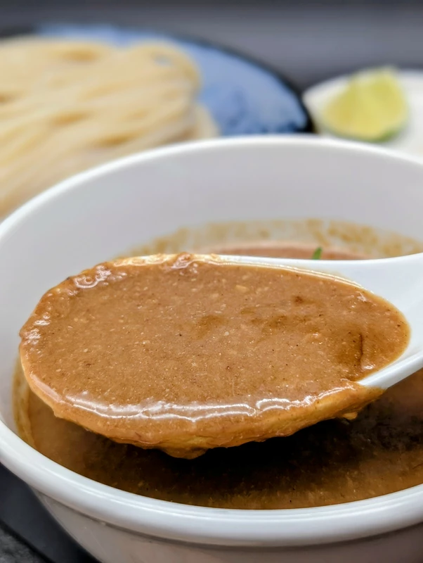 スープは濃厚な豚骨魚介醤油。余分な油分と雑味のないドロドロの粘度とザラザラとした舌触りで、旨味と甘味が強く、以前に本店で頂いた時よりも煮干が主張していました。