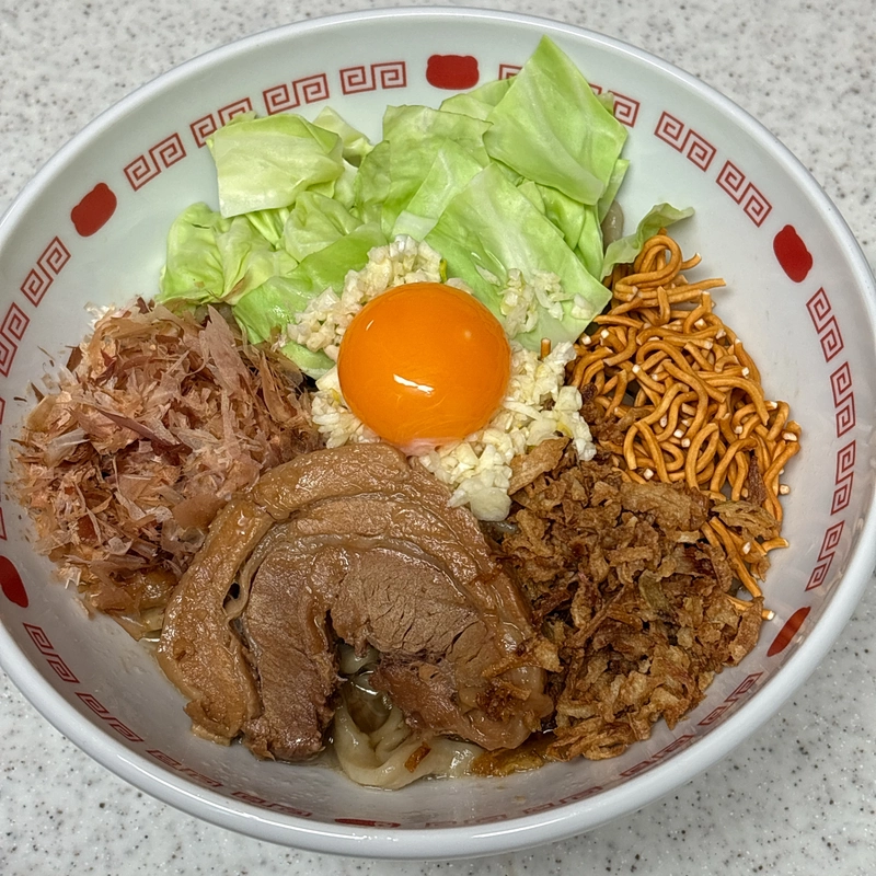 2026年01月11日 手打ち焔 ジャンクなまぜそば(二郎インスパイア汁なし・豚骨醤油) 極太縮れ麺に絡む濃いめのタレがいいね👍 あっさり こってり 薄味 濃い味 細麺 太麺 脂が少なく丼顔が寂しかったのでフラオニを追加TP🧅 濃いめのタレが極太縮れ麺に絡むように全体を混ぜると卵黄とにんにくがジャンク度をアップしてめちゃくちゃ美味しいやん😆 ベビースターの食感が最高💯これ始めに考えた人天才やね👏 0 役に立った レビューを共有