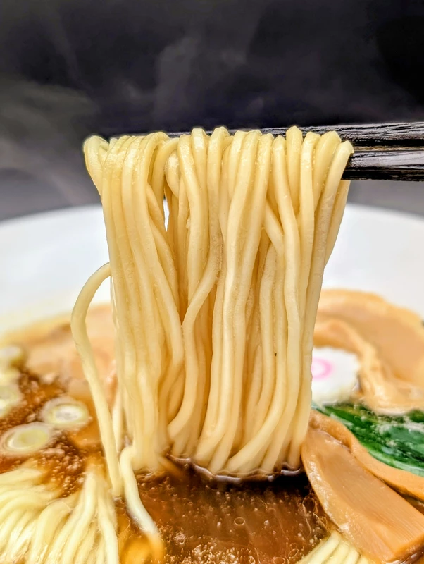 加水率が低くコリパツの食感で、茹で時間が短いとα化が不十分となり、長いとスープの吸い上げが弱まり一体感が薄まるという、やや扱いの難しいタイプです。