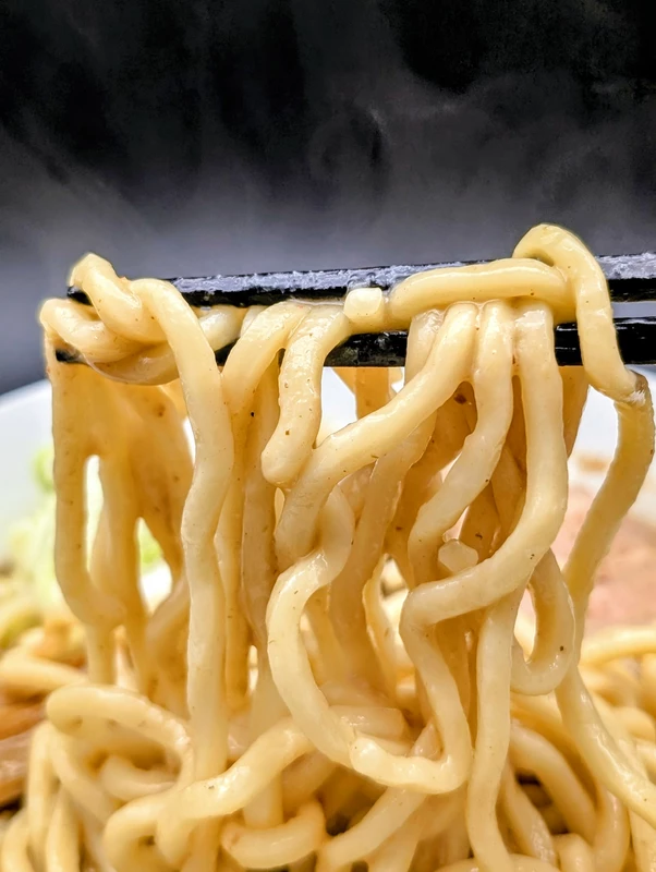 濃厚なスープを持ち上げ過ぎないよう相性を考えた上で、スープを拾いにくい緩ウェーブの太麺を選んでいると思いますが、