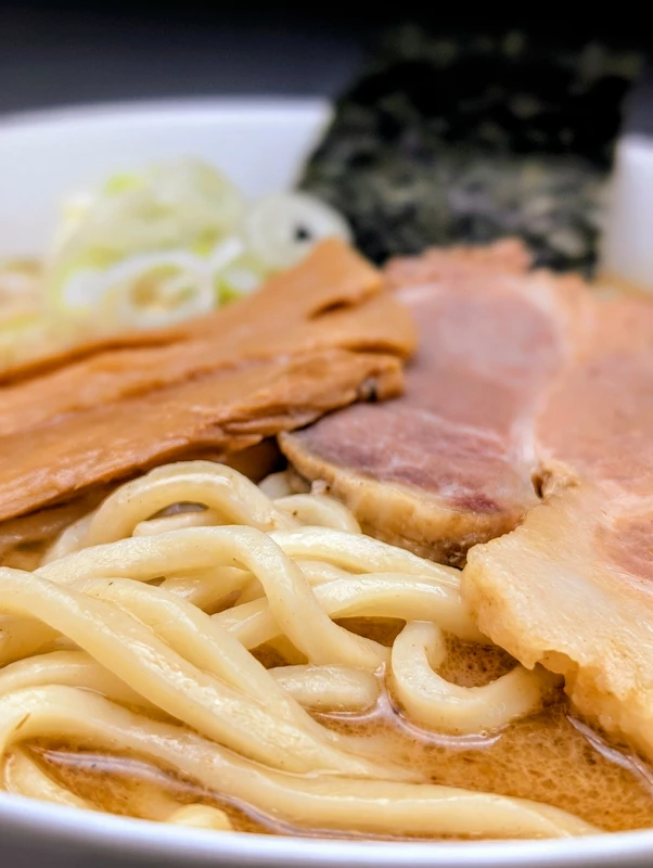 スープは濃厚豚骨魚介。魚粉のザラつきと動物系のコラーゲンのトロみとややドロっとした粘度があり、