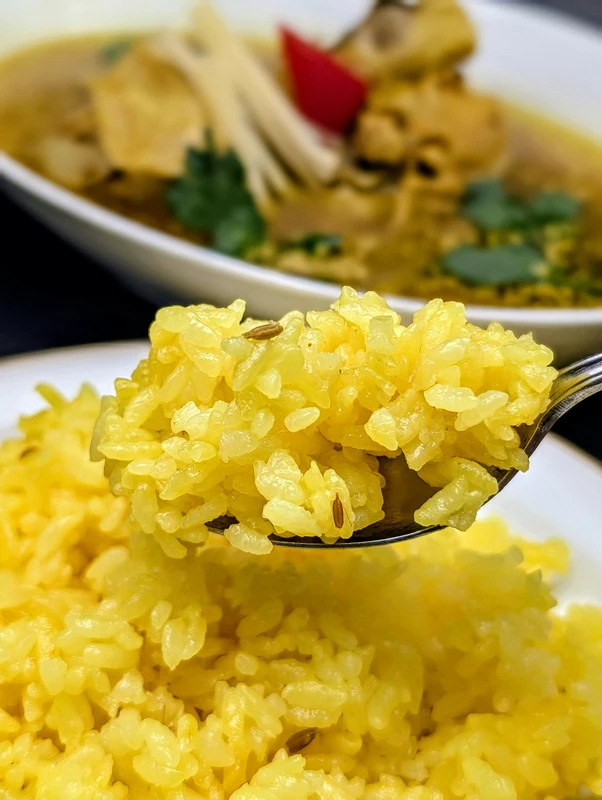 ライスはやや硬めに炊かれたジャポニカ米のターメリックライスで、