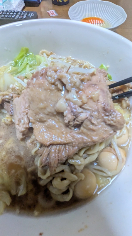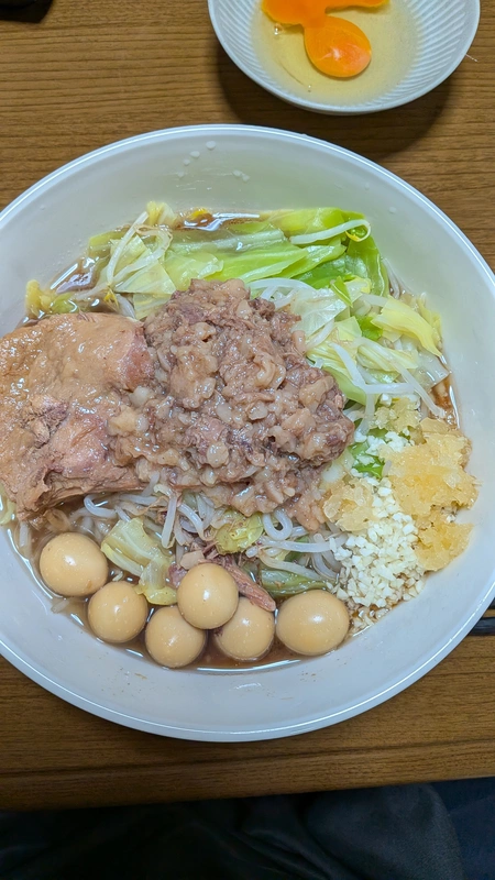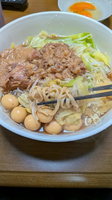 2026年02月12日 ラーメン マルキ ラーメン(二郎インスパイア・豚骨醤油) 美味しく頂きました あっさり こってり 薄味 濃い味 細麺 太麺 美味しかったの一言です! スープ、甘めで自分好みの味です ですが、スッキリした後味なので飽きずに食べれます 麺は、沸騰してから3分半ぐらいだと少しゴワゴワ感がありゴワゴワ感が好きな方はこれぐらいで、私は4分チョイ茹でました ちょうど良い、硬さと柔らかさがあり麺の味もしっかりしていました とにかく、豚が大きくてビックリしました! 食べ応えが有ります トッピングで、ウズラの卵を入れました そして、途中で生卵も追加、なめらかな味わいです この、スープが好きですが一味や魚粉を入れて食べたら、味の変化も楽しめました 最後に、お酢を入れて食べてみたら、スッキリした味わいでした また、リピートします! 0 役に立った レビューを共有