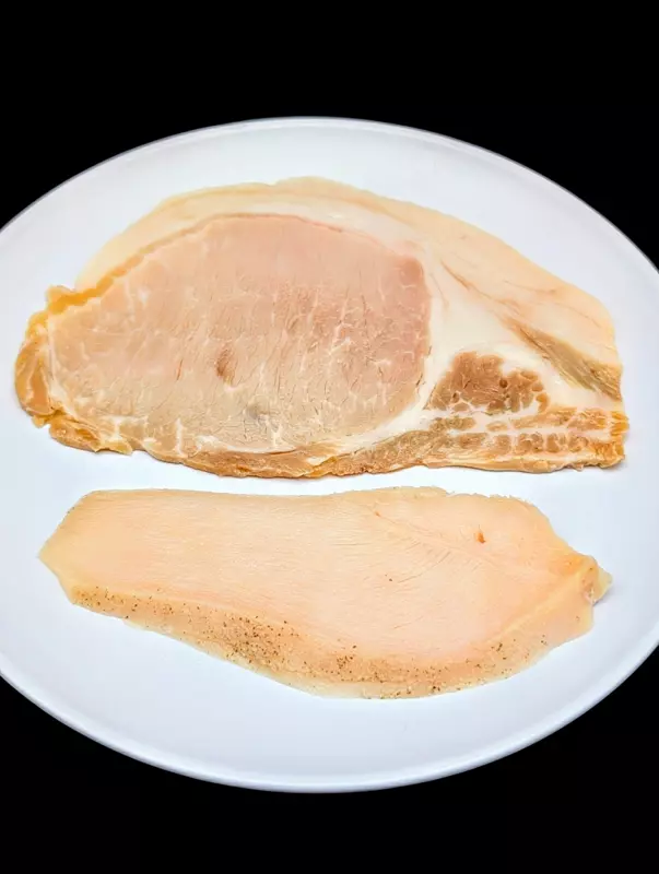 瑞々しく仕上げられた低温調理なので湯煎は厳禁。流水やぬるま湯など、豚脂の融点を超えないように30℃以下の温度で緩やかに解凍しましょう。
