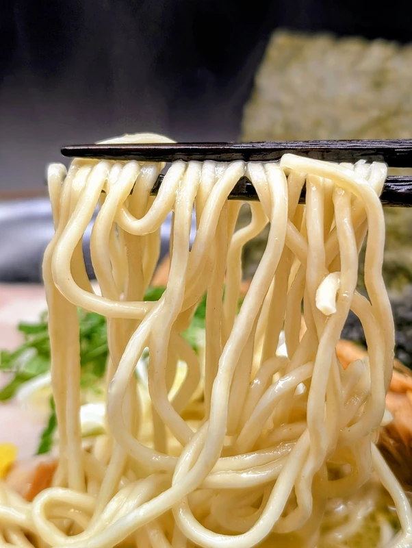 ザクパツとした歯切れの良さと小麦の香りがスープとマッチしていますが、実店舗は結構硬めなので、指定時間内で短めに茹でると再現度が増します。