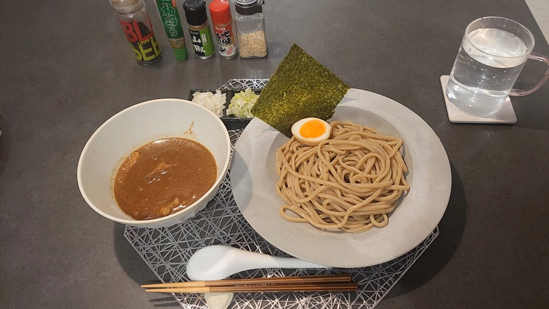 小麦感のある極太麺と薬味がガツンと利いたタレ。甘いという評価もありましたが、あまり気にならず、とても美味しかったです。