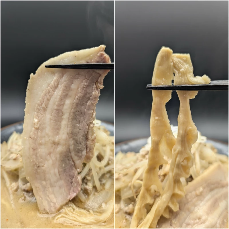 実店舗より若干少なめの量ですが、それでも一般的には大盛りのボリュームで、食感もツルツルの麺肌とムチグチの強い弾力で食べ応えがあります。