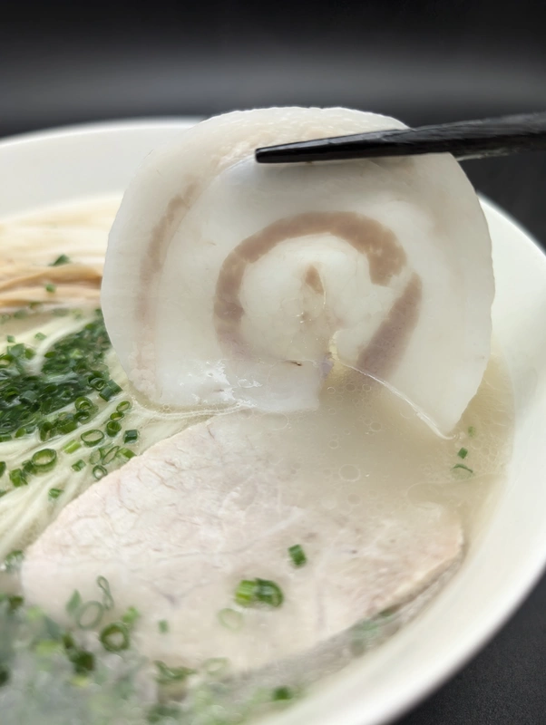 付属トッピングは無鉄砲と同タイプの肉厚でムッチリ弾力ある豚バラロールスライスチャーシュー3枚と、ゴリシャキ太メンマ2本に鳴門巻が1枚。