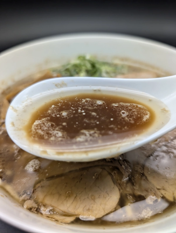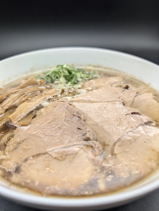 チャーシューはモモではなくバラスライスが1枚で、吊るし焼きの香ばしいオーク香がほんのり漂っています。