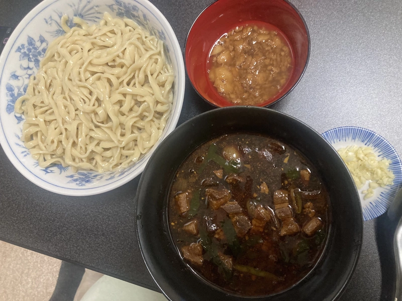 思わず「うま!」と声が出た。煮干し味は控えめだが、ガツンとくるちょっと甘辛味のある濃厚スープ。厚めの油膜で熱さも保たれる。角切りチャーシューとメンマもいい。柚子もいいアクセント。麺ももちろん美味しい。あまり食べたことのないタイプの、中毒性のあるつけ麺。