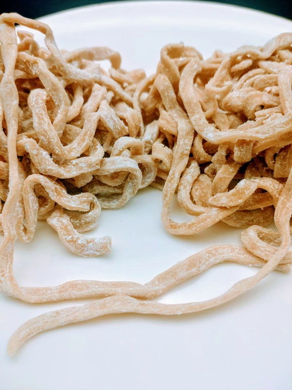 画像1枚目は右が富士丸製、左が宅麺CK製です。宅麺製が白っぽいのは打ち粉によるもので、どちらもオーション麺です。