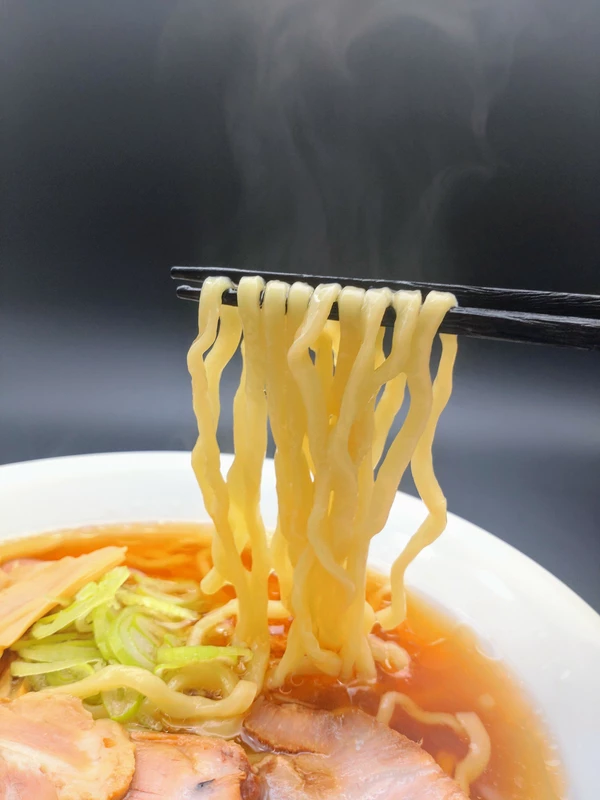 一般的な喜多方麺よりやや厚く、適度な縮れともっちりとした弾力と強いコシ、