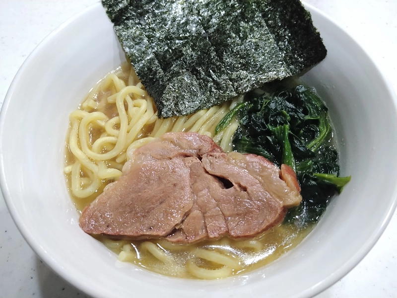 トッピングは中大判のロースチャーシュー、穂先ロングメンマ、大きめの海苔。
