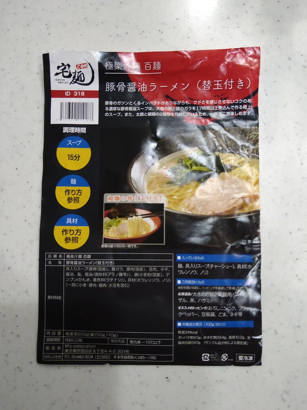 追加トッピングはネギと海苔。途中でオススメの天かすとワサビで味変。ワサビも良く合うが、カリカリの天かすが予想以上のアクセントで味変効果抜群。麺は表面ツルツルの極太平打ち。茹で時間15分ほど掛かるがモチモチの食感でとても美味い。具材は親鶏の鶏肉とナルト。鶏肉は歯応えしっかりのコリコリ食感で旨味がありとても旨い上に量もたっぷりが嬉しい。スープは冷凍庫から取り出した後、冷蔵で解凍する。スープに油分はそれほど無いが冷蔵し過ぎると多少の脂の塊が出来るので、冷やし過ぎないくらいが丁度良い。魚介の旨味が良く効いた鶏中華な印象で冬でも美味い。
