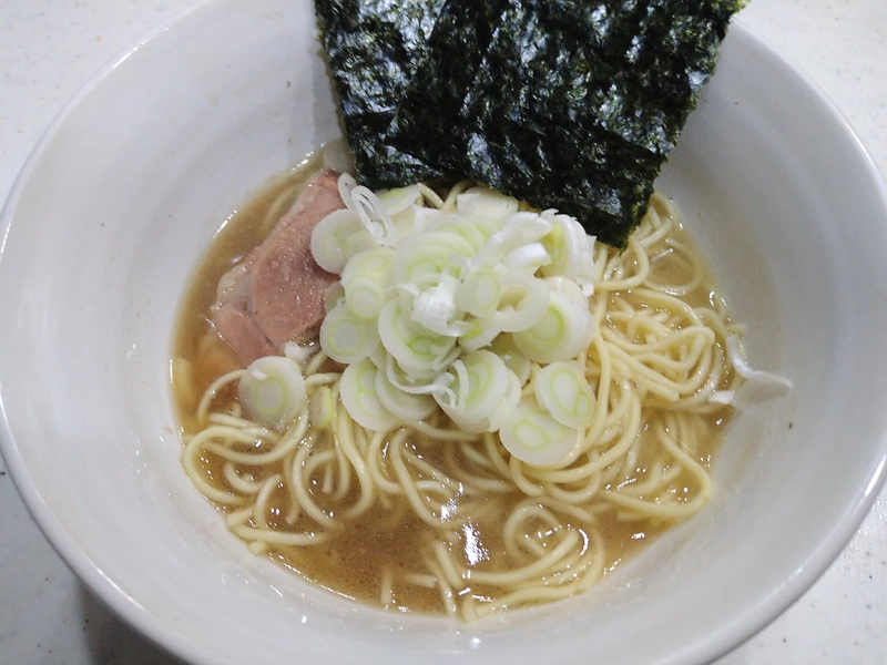 追加トッピングはネギとタマネギと海苔。茹で時間2分の麺はツルッと啜れてスープとの相性も良好。具材はレアチャーシューで薄く肉質はしっかりめ。スープは淡麗な見た目に反して味は濃いめ。ガツンと来るシジミの出汁と強めの塩味、そして明らかな砂糖の甘みがダイレクト。砂糖は個人的に効き過ぎてる嫌いはあるが、それでも貝の旨味の滋味深さは身体に沁み渡る。刻みタマネギとの相性抜群なので面倒でも用意した方が良いと思う。