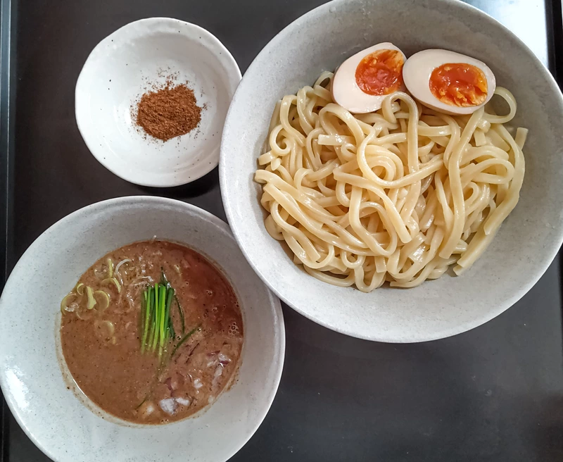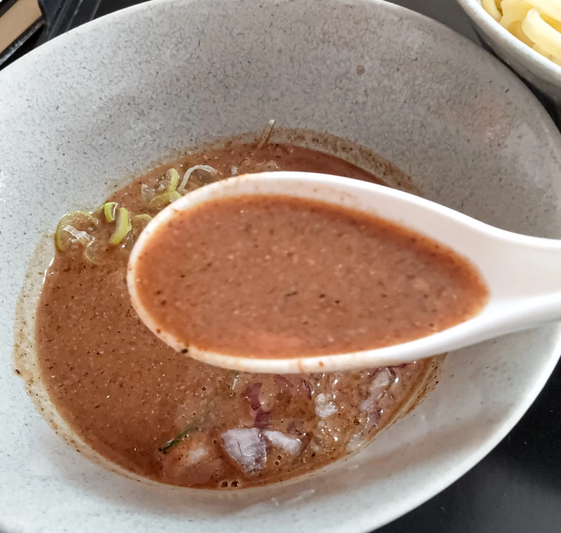 海老の魚粉を混ぜたつけ汁は一口目から海老で甘めの濃厚スープです。食べごたえのある麺との相性も良いですが最後は少しキツくなる味わいです。