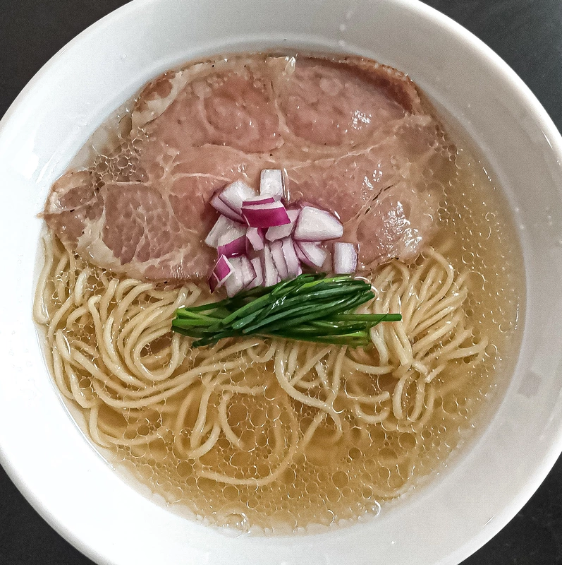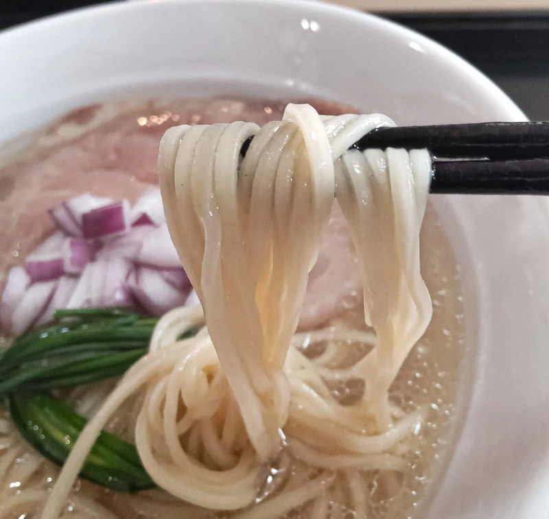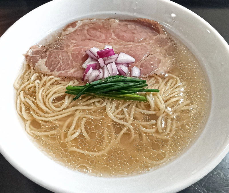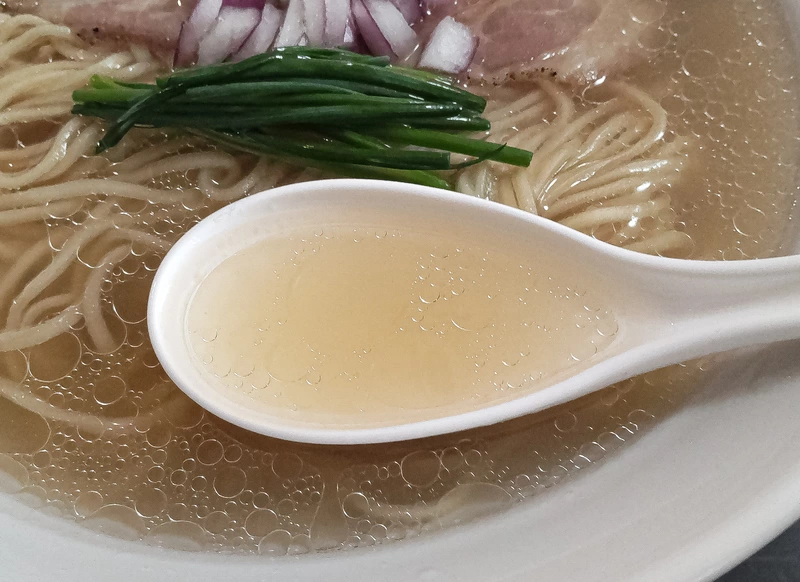 黄金色の透き通ったスープは、しじみを中心に様々な貝の旨味がバランス良く纏まり、そこにパンチのある塩ダレが加わることにより相乗効果となって最後まで飲み干せるスープとなっています。細ストレート麺は喉越し良くスープに良く絡みます。大ぶりなチャーシューは前日から解凍してレアな状態にするのがベストです。おすすめトッピングの刻み紫玉ねぎは必須です。