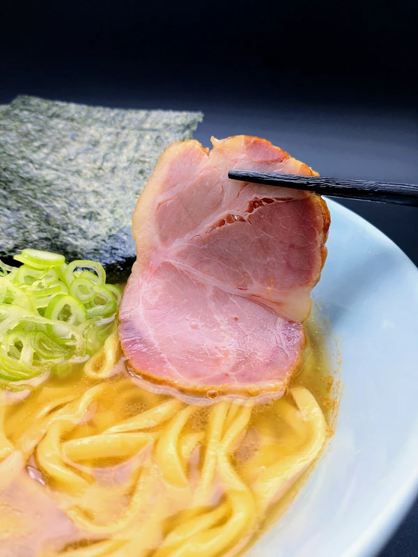 付属トッピングのチャーシューも直系スタイルのモモスモークスライスが1枚。