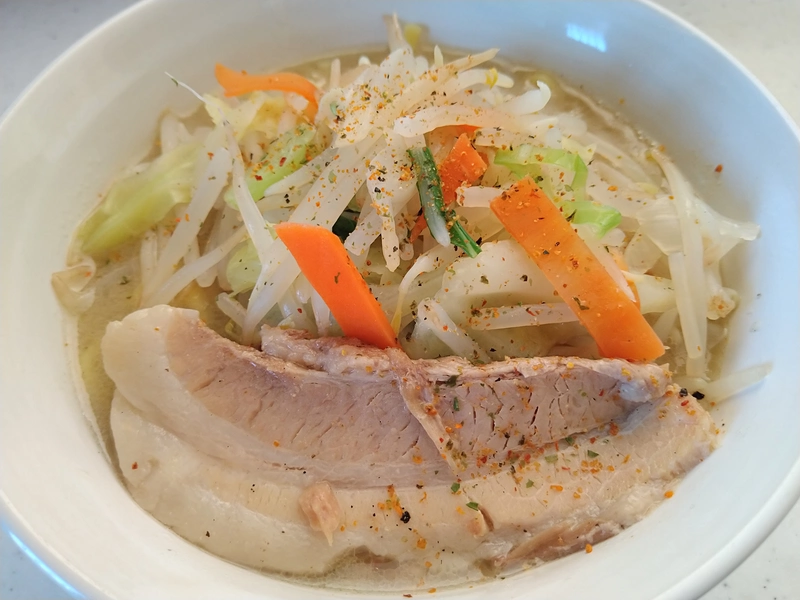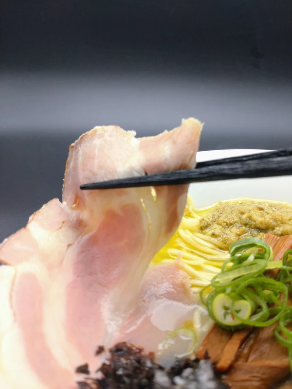 付属トッピングの豚肩ロースチャーシューは淡い味付けで、しっとりジューシーな仕上がり。