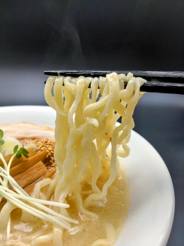 もちもちの弾力とコシの強さに麺自体の瑞々しい甘味がスープの塩味と旨味をより引き立てています。