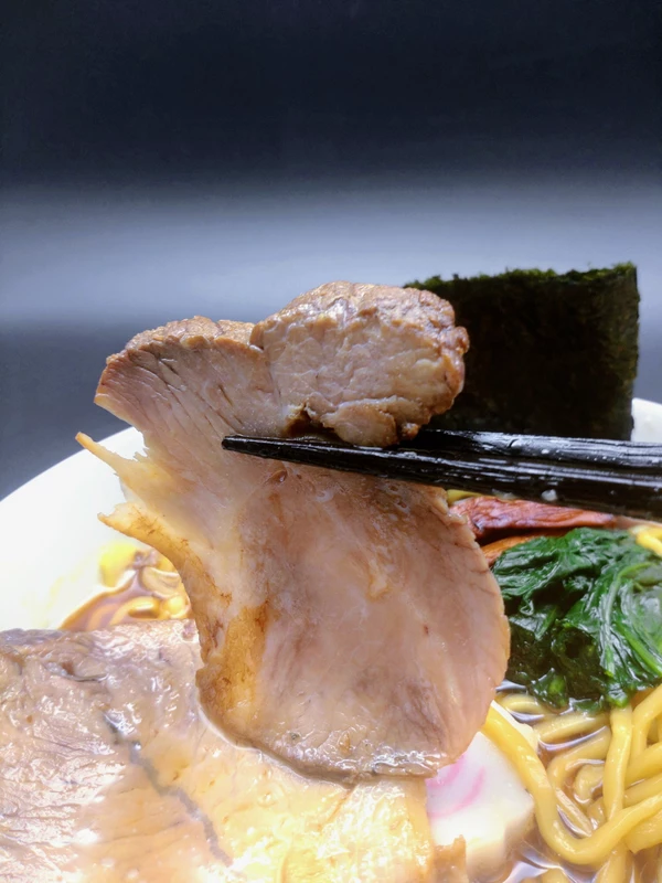 付属トッピングは味染みがよく、赤身しっとり脂身プルプルな厚切りバラチャーシューが3枚。