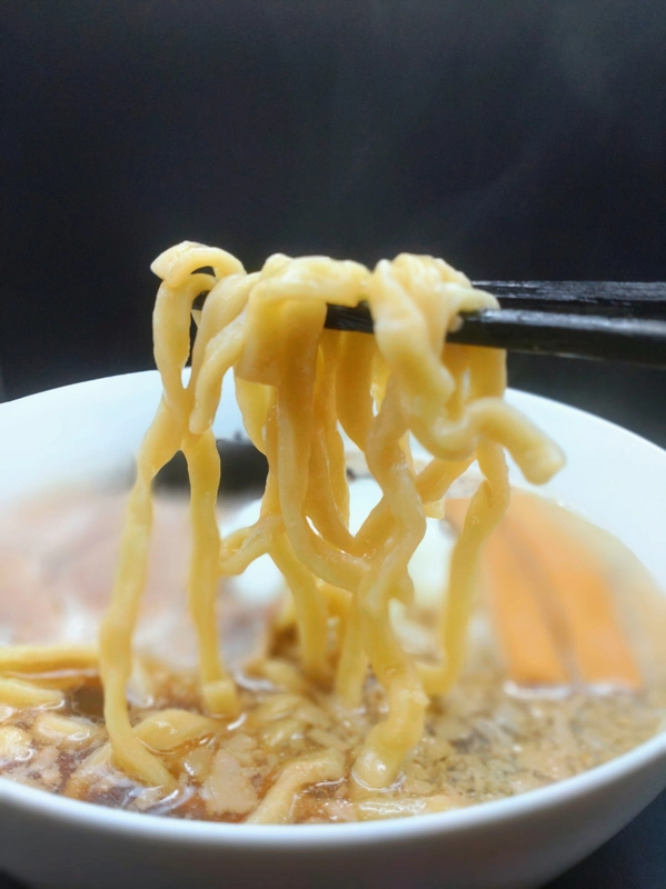 麺は平打の縮れ太麺。スープをしっかりと持ち上げる絶妙な太さと縮れ加減で、相性は抜群。