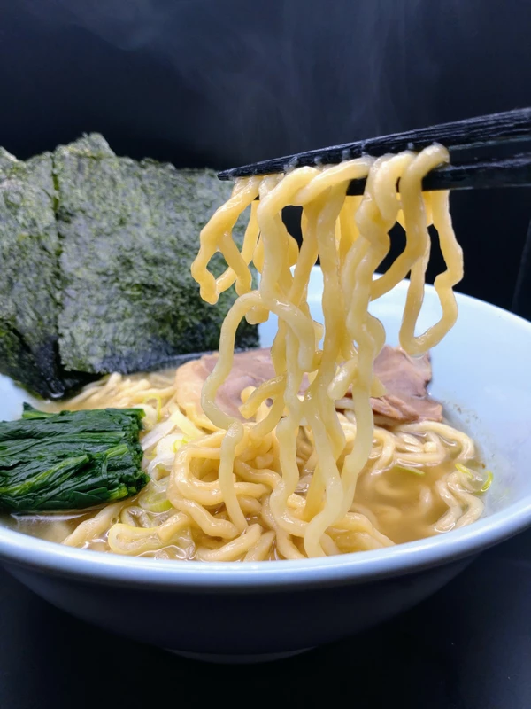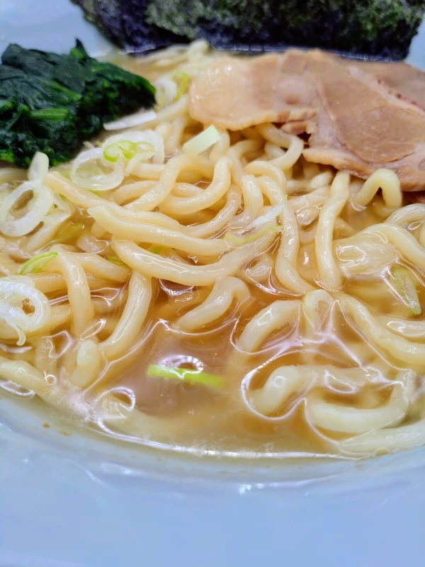 麺も家系麺の短尺平打中太とは異なるスクエア型の自家製角刃縮れ中尺太麺で、カタメにもヤワメにも適しています。