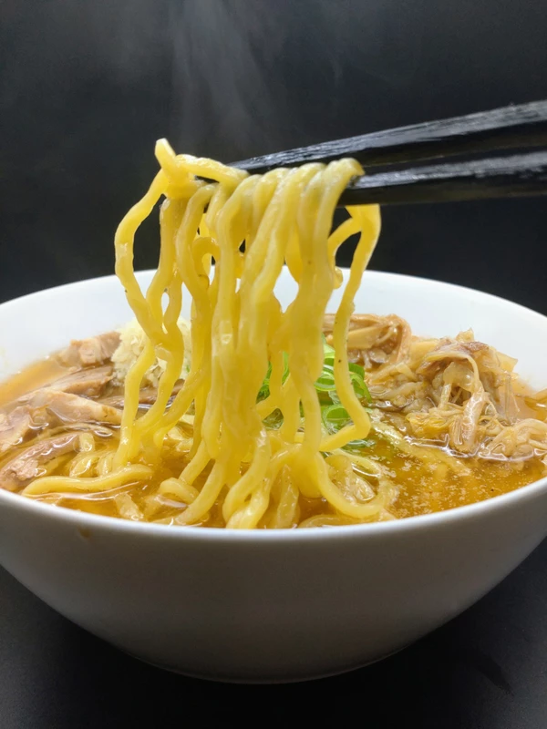 加水率34%という標準的な中加水麺で、ツルゴワワシモチの幅広い食感が楽しめます。