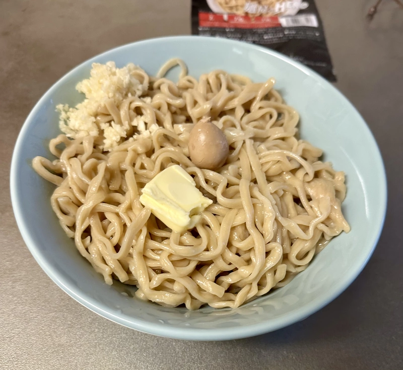 指定時間通りに麺を茹で、ニンニクとバターをトッピングしタレとよ〜く混ぜ混ぜしてパクり!