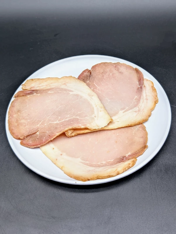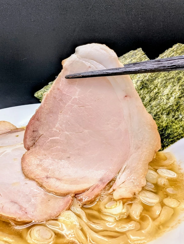 付属トッピングは豚モモ肉のチャーシューが3枚。特注の焼釜でじっくり吊るし焼きした焼豚で、しっとりモチムチの程良い燻香を残した直系スタイル。解凍は余計な熱を通さないよう、湯煎よりも流水のほうがベターです。